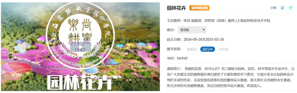 《园林花卉》课程2022年入选上海市级精品在线开放课程,2023年获批上海市高职高专院校现代农业与生物技术类专业教学指导委员会优质核心课程,2024年获批上海市课程思政示范课及教学团队。《园林花卉》课程是园林技术专业的理实一体的专业核心课程,对接上海都市现代园林人才需要,主动适应绿色生态的产业发展要求,结合尚农乐耕、为农服务的办学定位及服务园林绿化行业数字转型与技术迭代的专业目标而开设,将绿化工、花卉工、花境师等职业岗位标准、城市绿化等技能竞赛标准融入课程。课程以《植物基础》等课程为基础,为《植物造景》等专业课程提供景观营造重要素材——花卉素材做好准备。