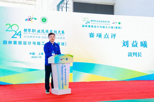 刘益曦在赛项点评表示,作为此次大赛承办单位的上海农林职业技术学院,从赛前至赛中都给予了周到的服务和服务保障,呈现了一场高水准、高质量的技能大赛。他指出,今年的比赛与以往相比有很大的变化,不再限制名称、内容、设施和物料,更加注重从单一技能展示向综合素养展现的转变。各参赛队伍的作品不仅造型外观优美,更富有特色内涵,充分展现了参赛选手的创新意识和应用能力。他还围绕团队交流分工、施工安全意识、应用价值、汇报环节、创新创意等五个方面进行了详细的点评,为各参赛队伍提供了宝贵的经验和建议。