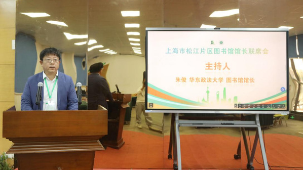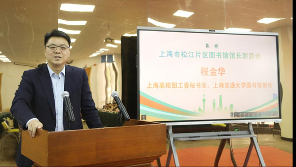 程金华在致辞中对我院承办联席会表示感谢,同时感谢松江片区图书馆馆长对上海高校图工委工作做出的贡献。介绍了上海交通大学图书馆在人工智能方面开展的工作和未来设想,强调不仅要实现AI在校内赋能,更好服务师生,更要实现AI赋能在图书馆之间能够互补,呈现1+1>2的效果。联席会开幕式由我院图书馆馆长樊清誉主持。