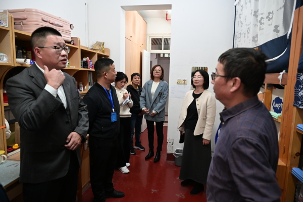 专家组一行前往4号学生公寓楼进行实地走访,从值班室、爱心屋、洗衣房、浴室、寝室内务到文化环境营造等多维度严格按照上海高校学生公寓“六 T ”实务现场管理实施标准进行了认真检查,仔细查阅了学生公寓档案情况。随后,来到“一站式”学生服务中心,对学生活动场所进行了实地查看。
