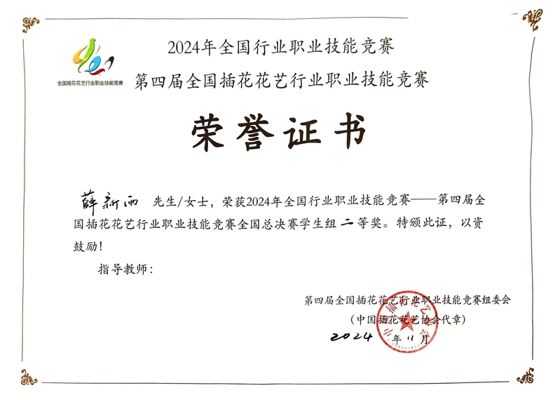 11月3日至4日,由中国插花花艺协会、中国就业培训技术指导中心共同主办的第四届全国插花花艺行业职业技能竞赛全国总决赛在山东临沂举行。总决赛分为职工组和学生组2个组别,44名职工和17名学生从全国32个省市参加各赛区初赛的442名选手中脱颖而出,参加了本届总决赛。经过激烈角逐,我院植科系工程211班的薛新雨荣获总决赛学生组二等奖。