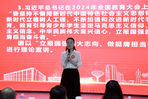 决赛分为学情分析、案例研讨和理论宣讲三个环节。在学情分析环节,重点考察辅导员对学生基本情况的了解和熟知掌握程度;在案例研讨环节,采用“我提问,你回答”的方式,主要考察辅导员对高校日常思政工作的分析能力、解决问题的能力以及教育引导学生工作能力、理论宣传阐释的能力;在理论宣讲环节,则紧贴新时代大学生的成长特点,以大学生更易于理解和接受的方式,推动党的创新理论在学生群体中深入人心。