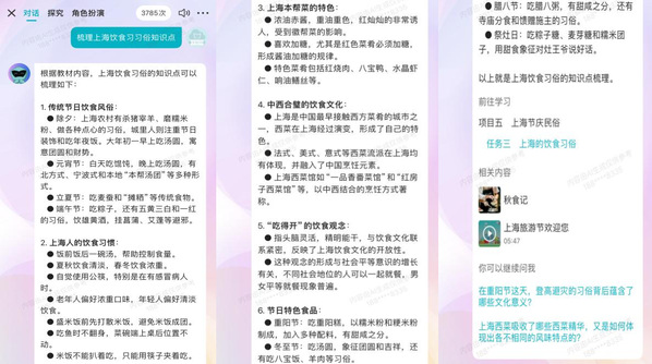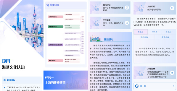 AI版《海派旅游文化》数字教材内容丰富,包含311张图片、25段视频、19段音频和65处交互式学习点。教材采用人工智能大模型技术,将知识内容训练成高精度的多模态专属模型,以支持多模态学习资源的推荐。教材支持学生通过AI对话式、探究式、角色扮演式三种学习模式进行学习。AI对话式学习能够实现精准问答,防止幻觉;探究式学习可以扩展到云教材知识范围以外;角色扮演式学习则通过“学习导师”引导学习,AI交互引导学生个性化自适应完成学习任务,并给出学习评估。教材整合了移动阅读、融媒体数字资源和AI交互式学习技术,通过媒体编排设计和交互设计,为学习者提供了一个丰富、可扩展、可互动、进度可跟踪的精致化阅读和学习体验。