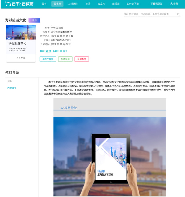 2024年11月,学院首部AI数字教材《海派旅游文化》在辽宁科学技术出版社出版,并同步在“云书·云平台”上线使用。