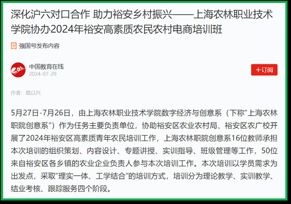 近日,路以兴老师撰写的案例《响应沪六对口合作政策利用上海数字经济优势培育裕安新型职业农民》获上海市教育评估协会“第一届非学历教育优秀案例”一等奖,是高职院校中唯一入选“一等奖”的案例。本案例的获奖既是学院与裕安区对口合作的成果,又是学院扎实推进服务乡村振兴工作的见证。