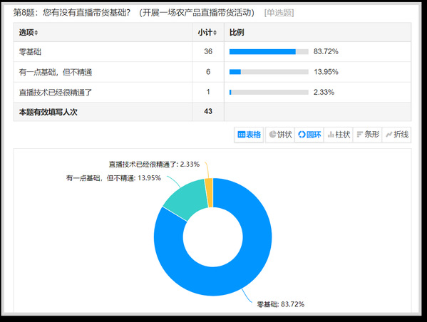 线上调研。农林学院坚持从学员实际需求出发,坚持理论教学与实践教学相结合、技能培训与企业运营相结合、集体培训与个性化指导相结合的模式,紧密围绕裕安区特色产业布局编制了调研问卷,2024年5月21日,通过问卷星对学员的知识技能基础开展了问卷调查,根据问卷结果,调整优化了部分课程内容,开展从文案写作到视频制作到直播销售的全产业链技能培训,使得培训内容更加符合学员实际需求。同时将调研结果反馈给了相关授课教师,为培训专家备课的针对性和科学性提供了依据。