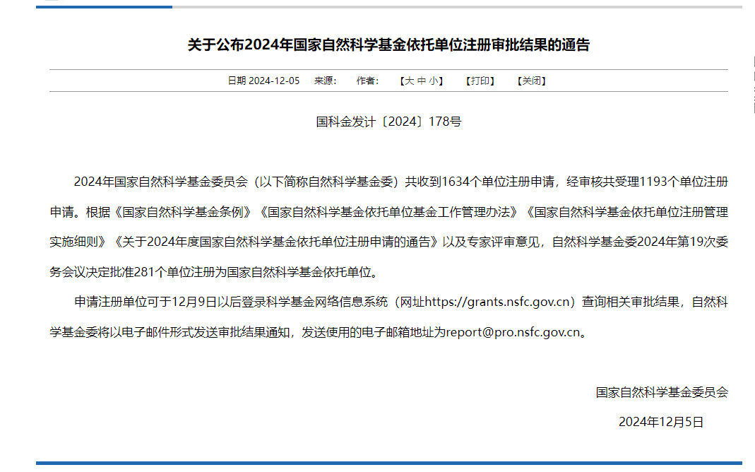 近日,国家自然科学基金委员会发布了《关于2024年国家自然科学基金依托单位注册审批结果的通告》(国科金发计〔2024〕178号),经过严格的评审流程,学院凭借自身基础研究能力和科研管理水平,成功获批为国家自然科学基金依托单位。
