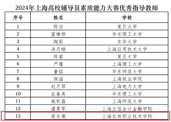 近日,由市教卫工作党委、市教委组织开展的2024年上海高校辅导员素质能力大赛在东华大学圆满落幕,经过激烈角逐,生物医药与健康系辅导员齐雪飞脱颖而出,斩获一等奖(高职唯一),学工部高东菊获评“优秀指导教师”,标志学院在该项大赛中取得历史性突破。
