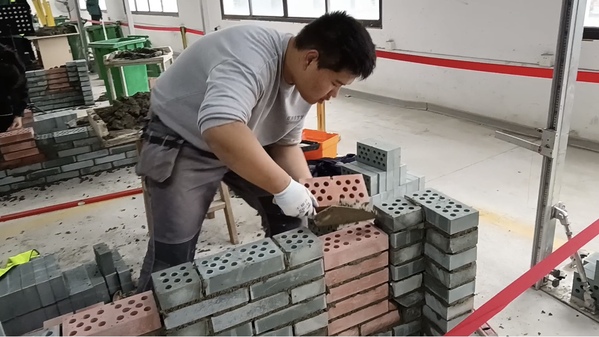 “砌筑”项目采用个人赛形式,我院派出3名同学参赛,与来自全市的10名选手同台竞技。比赛围绕识图与选材、放线与测量、砌筑施工、工程组织与管理4个模块展开。赛题巧妙地将上海传统建筑精髓——石库门元素融入题目之中,要求参赛选手在规定时限内,运用各自精湛的砌筑技艺,再现这一标志性海派文化符号。此举不仅彰显了传统技艺的无穷魅力,更对选手们的创新能力与临场应变能力提出了严峻考验。最后评委根据砌体的尺寸、水平、垂直度、平整度、细部、连接及成品等维度进行打分,“超过标准1毫米就要扣0.5分”。赛程时间紧,十分考验选手的忍耐力、集中精力、计划和合理安排时间、使用不同手工技能的个人能力。