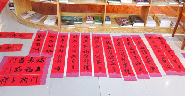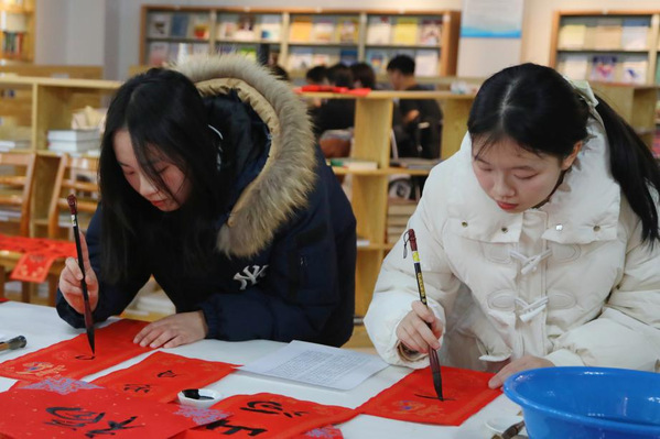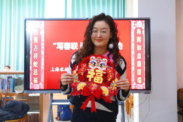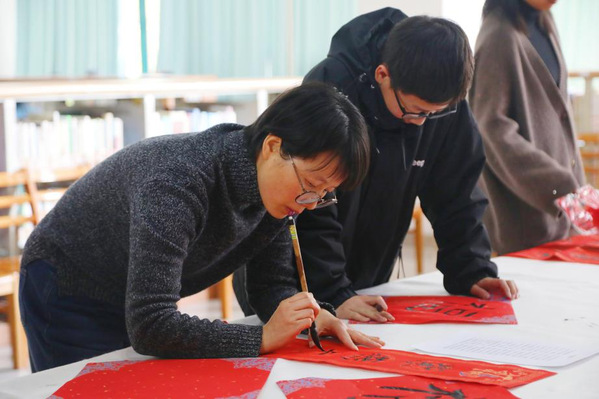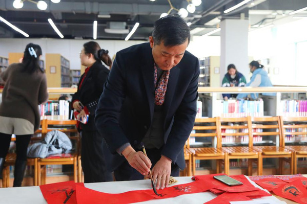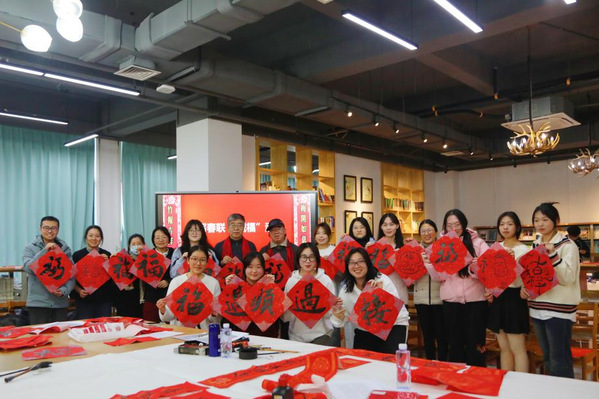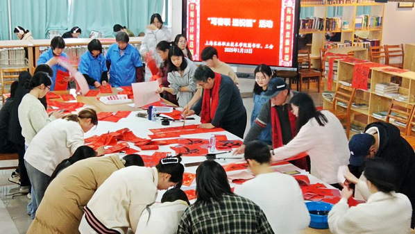 本次活动邀请中国书法家协会会员、上海市书法家协会楷书专业委员会会员郑小云和上海市书法家协会会员、上海市美术家协会会员朱柳杨两位书法名家为师生现场书写春联及“福”字贴。在现场,两位书法家根据师生的个性化需求,将心中对师生的新春祝福凝于笔端,在鲜艳喜庆的红纸上笔走龙蛇,一副副饱含深情、寓意吉祥的春联跃然纸上,传递着传统佳节的浓浓暖意,将墨香飘散在阅览室。