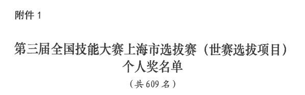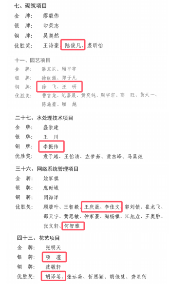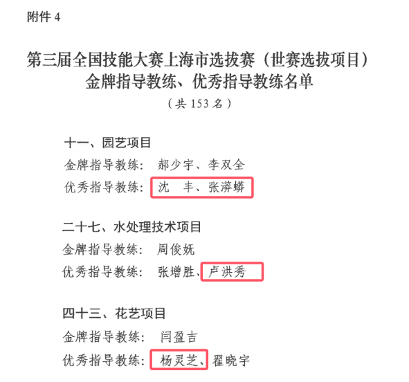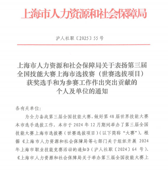 2月18日,上海市人力资源和社会保障局公布了关于表扬第三届全国技能大赛上海市选拔赛(世赛选拔项目)获奖选手和为参赛工作作出突出贡献的个人及单位的通知(沪人社职〔2025〕56号),学院砌筑、园艺、水处理技术、网络系统管理、花艺赛项共计9名选手获奖,其中,银奖1名,铜奖3名,优胜奖5名,4名教师荣获优秀指导教练称号。6名获奖选手入围第三届全国技能大赛世赛选拔项目上海市集训队。