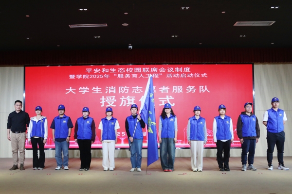 学院党委副书记、副院长邵阳为学院大学生消防志愿者服务队授旗