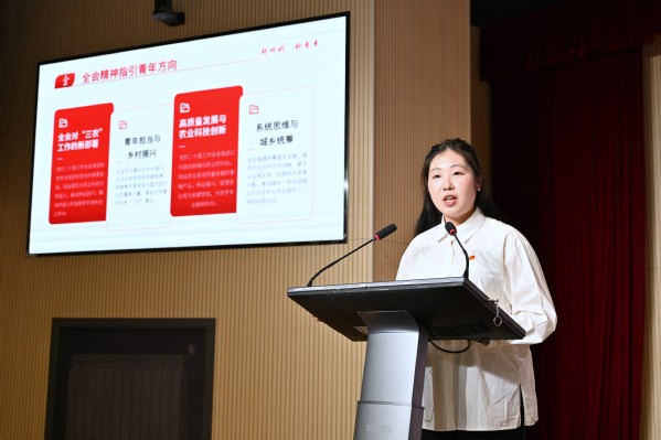 院学生会主席团成员,来自动医231班的陈珂围绕党的二十届三中全会精神展开宣讲,结合我院农学背景,阐述了新时代农科青年的历史使命与责任担当。全会提出“藏粮于地、藏粮于技”,聚焦粮食安全、农业科技创新及乡村振兴,号召青年在种业振兴、智慧农业等领域突破“卡脖子”难题。通过“海水稻”、精准农业等案例,阐明农学专业在保障粮食安全、推动绿色转型和数字化转型中的核心作用。青年应深耕科研创新、田间实践及跨界融合,以袁隆平、黄文秀等为榜样,将论文写在大地上,助力农业现代化。宣讲呼吁农科学子以青春之力,扎根乡村,争做中国式现代化的“先锋队”,用实干担当谱写丰收篇章。
