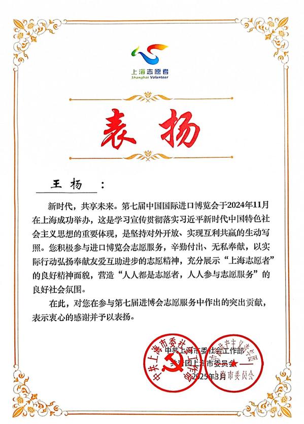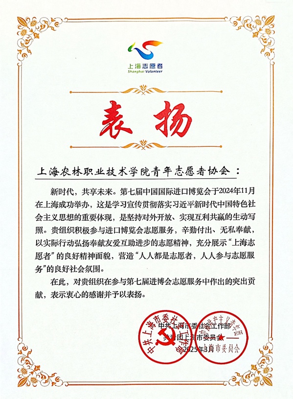 近日,中共上海市委社会工作部、共青团上海市委员会联合下发《关于通报表扬第七届中国国际进口博览会优秀志愿者和志愿服务先进集体的决定》,我院青年志愿者协会获评第七届中国国际进口博览会志愿服务先进集体,花艺231班王杨同学荣获优秀志愿者。