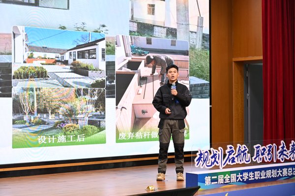 张阿龙以“雕琢大地画卷 书写生态华章”为主题,从所学专业、职业解读、岗位胜任力、发展潜力等方面,阐述了对景观设计师这一职业的思考和理解。结合参赛经历,他分享道:“从系赛到校赛,再到市赛与国赛,这一路走来,每一次突破都离不开老师们的倾力支持与悉心指导。感谢指导老师们,是你们在最初鼓励我将兴趣与责任结合,描绘职业的轮廓,陪伴我一路走向国赛的领奖台;是你们在一轮又一轮打磨中,助我将模糊的想法凝练成清晰的表达;感谢老师们提供的培训支持和个性化指导,让我在更高的平台上沉淀表达、拓展视野。在走向国赛的过程中,我更加体会到,一份职业规划的诞生从不只是一个人的努力,而是集体智慧的积淀,是平台给予的温度和推力。我此次参赛的职业规划围绕守正创新展开,这也让我重新思考景观设计师的本质与使命。虽然行业面临下行压力,但中国的景观总要有人去做,我愿意用更利民的设计理念和更新的技术去服务于中国景观。在农林这片包容、开放、勇于开拓的舞台上,我学会了如何将个体的热爱融入时代的脉络,也更加坚定了以人为本的设计理念为指引的职业理想。未来,我仍将怀抱初心、肩负责任,在雕琢大地画卷的道路上,努力成为那个为改变生态贡献力量的人。”