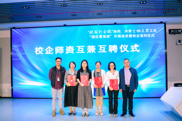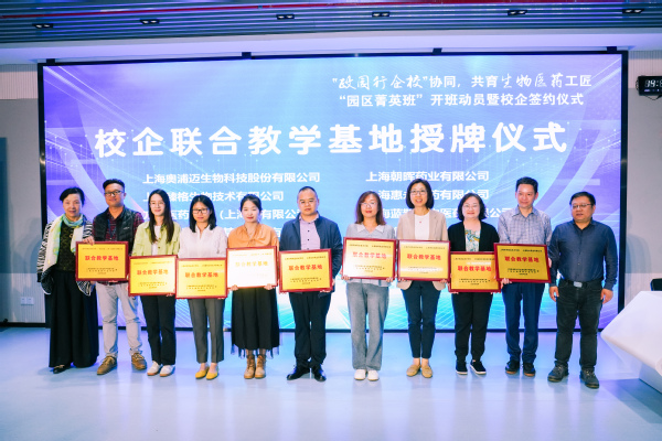 在校企联合教学基地授牌仪式环节,张江与上海医药行业协会高级顾问孙秋华为和元智造(上海)基因技术有限公司、上海宝济药业股份有限公司、上海衡山药业有限公司等9家企业授牌;仪式期间举行了开班动员、校企师资互兼互聘、企业宣讲和学生代表发言。