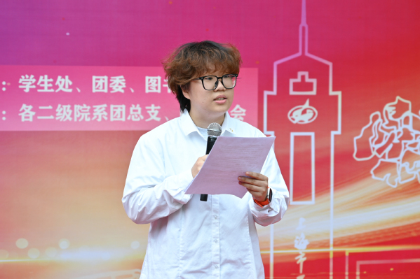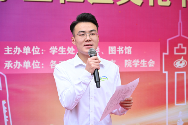 “四·时”读书社社长张贵鹏作为学生代表分享了自己在“一站式”学生社区的成长记忆,呼吁同学们一起参与学习通平台尚农智慧图书馆“耕读21天 书香伴我行”共读打卡活动,在阅读中,找到更加辽阔的精神和丰富的自我。