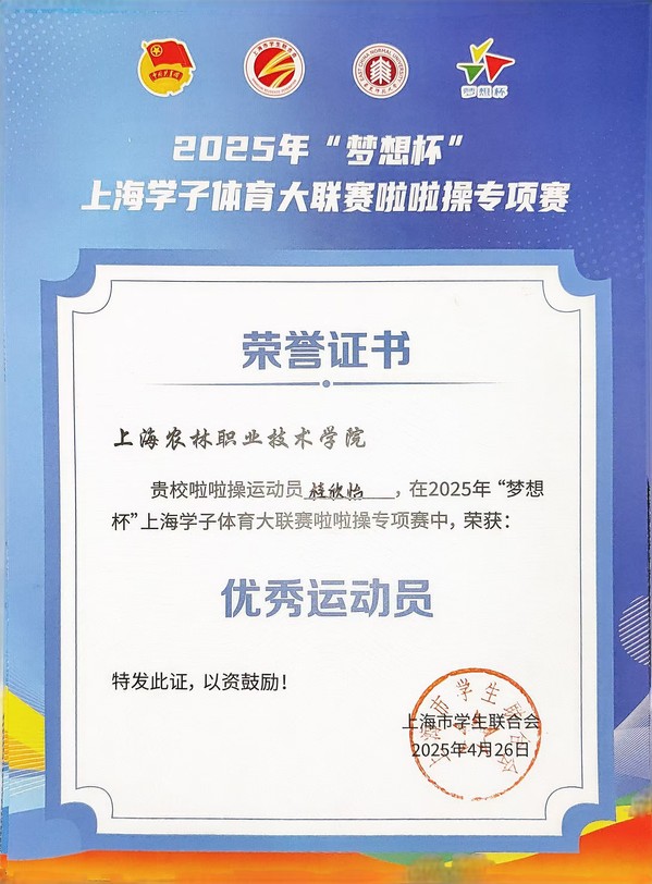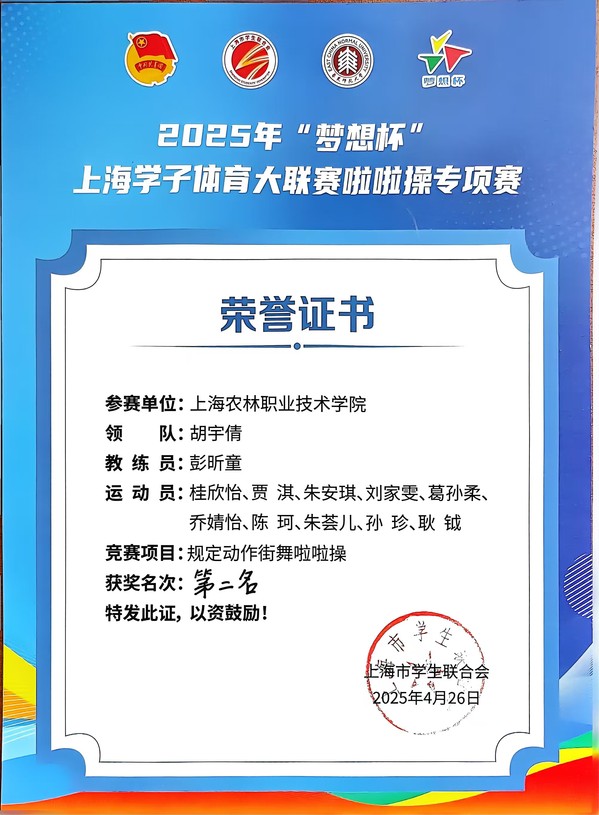 4月26日,“梦想杯”上海学子体育大联赛啦啦操专项赛在华东师范大学体育馆(闵行校区)举行。我院啦啦操队伍与来自上海市其他高校的79支代表队伍同台竞技,最终获得集体街舞1级规定动作第二名,学院获优秀组织奖,桂欣怡获优秀运动员称号。