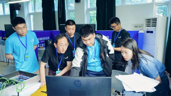 赛项技术支持工作由我院与上海中域工业互联网研究院共同承担。面对赛事筹备时间紧、技术要求高的挑战,双方组建专业团队协同作战:从工业互联网实训台、边缘网关等核心设备的调试部署,到11个标准工位的网络架构搭建;从竞赛题库开发、技术文件编制,到赛前选手培训与设备熟悉环节,均严格对标国赛标准。技术团队12名工程师全程驻场保障,确保每两个工位配备1名技术人员,全力为选手打造公平、专业的竞技环境。