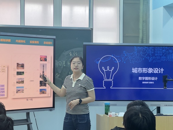 创意系蔡新元老师以“城市形象LOGO设计”为主题展开教学,一方面通过讲解城市形象设计的三大原则(系统性、现代性、文化内涵),帮助学生理解如何通过图形抽象化、标准化和文化符号转译来传达城市精神;另一方面结合上海地标案例(如中共一大会址、石库门、外滩等),引导学生将文化元素转化为数字化设计语言,深化对设计内涵的理解。
