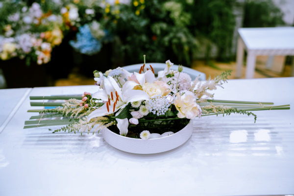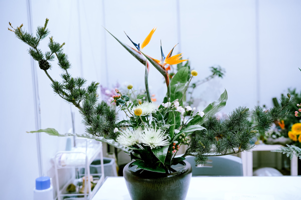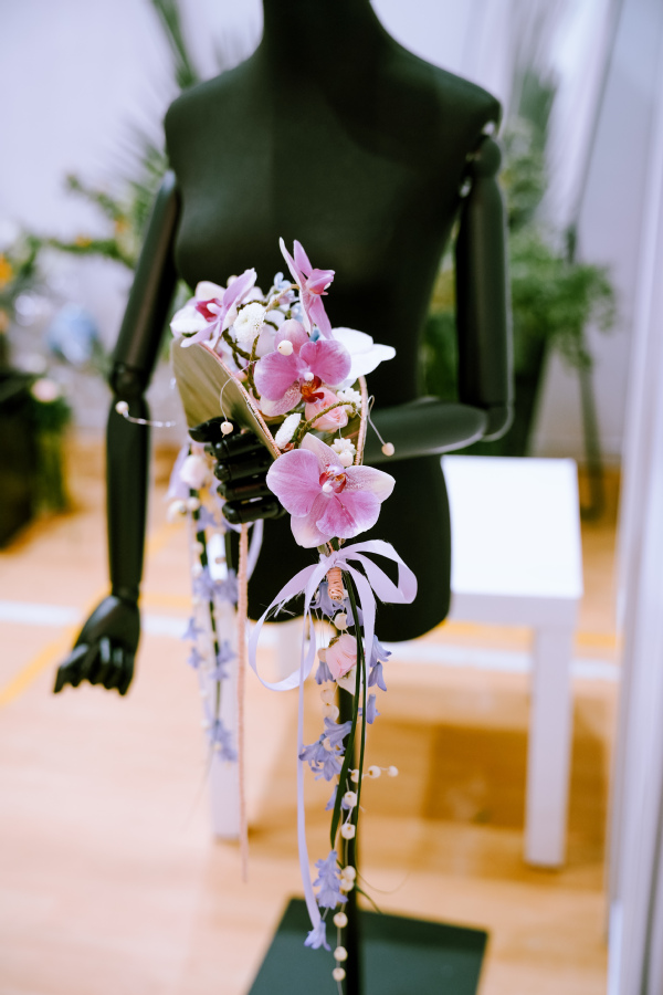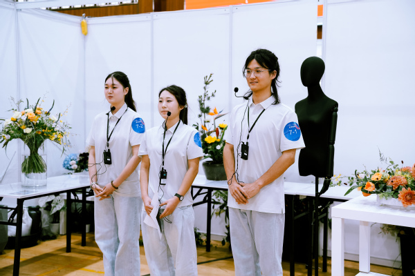 作为上海市职业教育品牌赛事,本届花艺赛项实现赛制突破性改革,将传统个人赛升级为每队3人的团队赛,比赛形式从单一技能操作拓展为技能测试环节+综合展示双环节考核体系。技能测试环节,比赛时限为180分钟,选手需团队协作完成5个模块任务,涵盖花束设计、传统插花等模块;综合展示环节,限时8分钟,要求各参赛队伍基于技能测试环节的内容及过程进行展示和阐述。