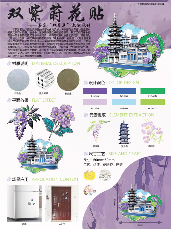 嘉定区栅桥公园接力首届上海环城公园生活季于5月20日举行,期间揭晓了首届嘉定园林“双紫花”数字文创设计大赛获奖名单。“双紫花”文创设计大赛由数字经济与创意系风景园林设计专业承办,大赛旨在深入挖掘嘉定园林文化内涵,通过融入“双紫花”(紫藤与紫薇花)打造特色文创产品,展现嘉定园林花卉独特魅力,传播深厚历史文化底蕴,促进文创产业创新发展,提升嘉定文化品牌影响力,同时助力“共生・共享”的首届上海环城公园生活季。