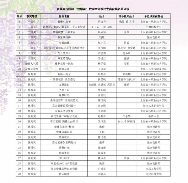 本次大赛共评选出一等奖1名、二等奖2名、三等奖5名,最佳人气奖1名,最佳创意奖1名,优秀奖20名。获奖作品在创意性、文化性和实用性等方面表现出色,充分展现了嘉定园林 “双紫花” 的特色和魅力。