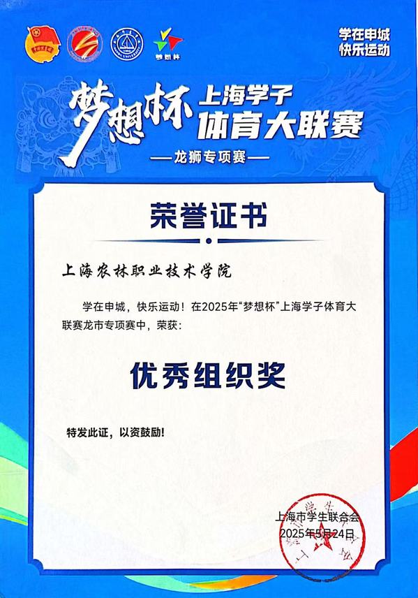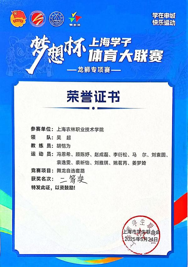 “梦想杯”上海学子体育大联赛龙狮专项赛于5月24日举行。我院舞龙队伍派出11名队员参赛,与来自上海市其他高校的23支代表队伍同台竞技,最终获得舞龙自选套路二等奖,上海市首届高校龙狮精英赛舞龙自选项目三等奖,学院荣获优秀组织奖,赵成磊获最佳运动员。