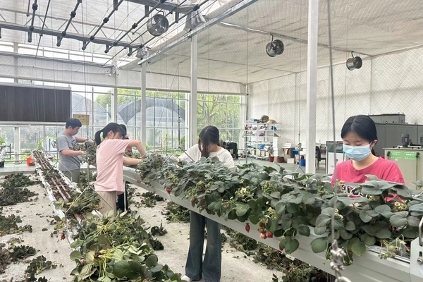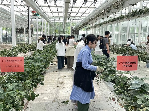 田间实践活动里,各系学生分批有序前往实训基地投身不同劳动项目。动物科学技术系学生利用物联网系统,在草莓大棚内通过传感器监测,精准调整无土栽培环境,解决草莓苗光照不足问题。数字经济与创意系学生负责清理已结束实验的草莓苗和薄膜,双手熟练操作,感受劳动与泥土的气息。生物医药与健康系学生则在黄瓜挂绳搭架工作中,顶着烈日,严谨完成每道工序,展现出专注与耐心。