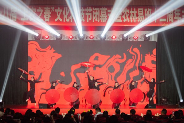 当天还举行了“‘易’路繁花十二载,尚农‘网’育新生态”农林易班十二周年主题活动。微电影《青春接力》拉开活动序幕,讲述大学生从迷茫到坚定参军报国的成长故事,传递理想信念的力量。随后,《云赏雅集・衣裳的时光之旅》精彩上演,学生身着汉服展示非遗作品,并融入环保服饰走秀,彰显文化自信与第二课堂教学成果。各系部带来歌伴舞、心理剧、配音秀、朗诵、街舞等节目,展现学子青春活力。
