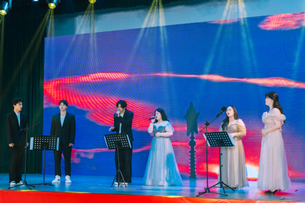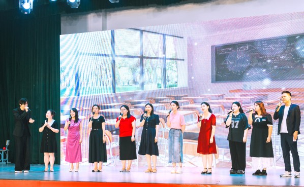 毕业典礼现场,大学生艺术团、配音社、辅导员代表、教师代表和毕业生代表带来小合唱《世界赠予我的》、街舞《流行之星》、配音《音你精彩》,师生歌曲串烧《歌声里的青春》和毕业视频《那些年,我们一起走过的时光》为全体毕业生送上真情寄语和深深祝福。从初入校园的青涩无措,到即将踏上新征程的坚定,点点滴滴都铭记于师生的内心深处。全场气氛热烈,毕业生们挥动手中的国旗,表达了深深的爱国之情和对母校的深深眷恋。