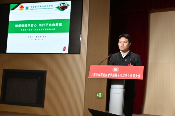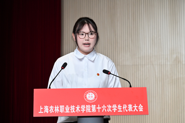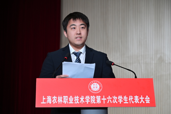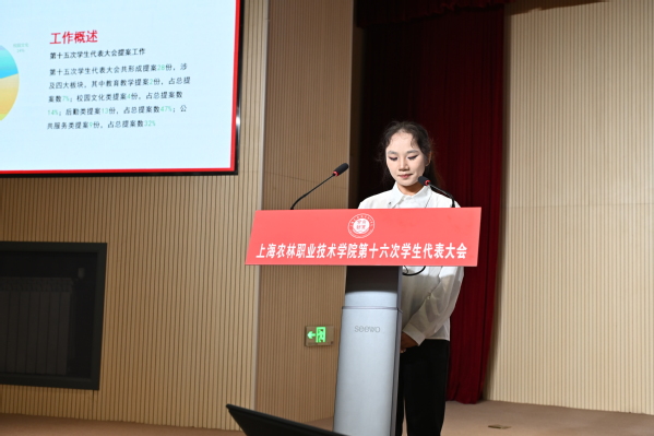 第十五届学生会主席团执行主席陈珂、潘旭涛分别汇报《上海农林职业技术学院第十五届学生会工作报告》,院学生会权益部副负责人谢海若汇报《上海农林职业技术学院第十六次学生代表大会提案工作报告》,主席团成员汪婷玉宣读大会倡议书。