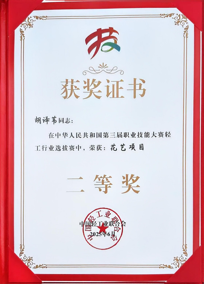 6月14日至17日,在中华人民共和国第三届全国职业技能大赛轻工业行业选拔赛花艺项目中,我院花艺231班胡译苇同学凭借精湛技艺,与来自全国19个省、自治区、直辖市的优秀选手同场竞技脱颖而出,荣获二等奖。本次大赛由中国轻工业联合会主办,轻工业职业能力评价中心、上海建设管理职业技术学院、上海城建职业学院和上海农林职业技术学院联合承办。