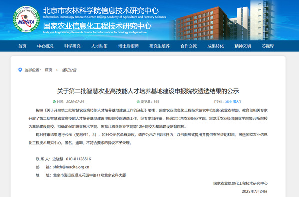 据悉,此次遴选工作严格按照《关于开展第二批智慧农业高技能人才培养基地建设工作的通知》要求,由国家农业信息化工程技术研究中心组织农业农村部、教育部相关专家共同开展。经过专家组严谨评审,全国共确定38所院校为基地建设院校。我院智慧农业工程系凭借在智慧农业专业建设、产教融合实践、技术技能人才培养等方面的突出表现,从众多申报院校中脱颖而出。