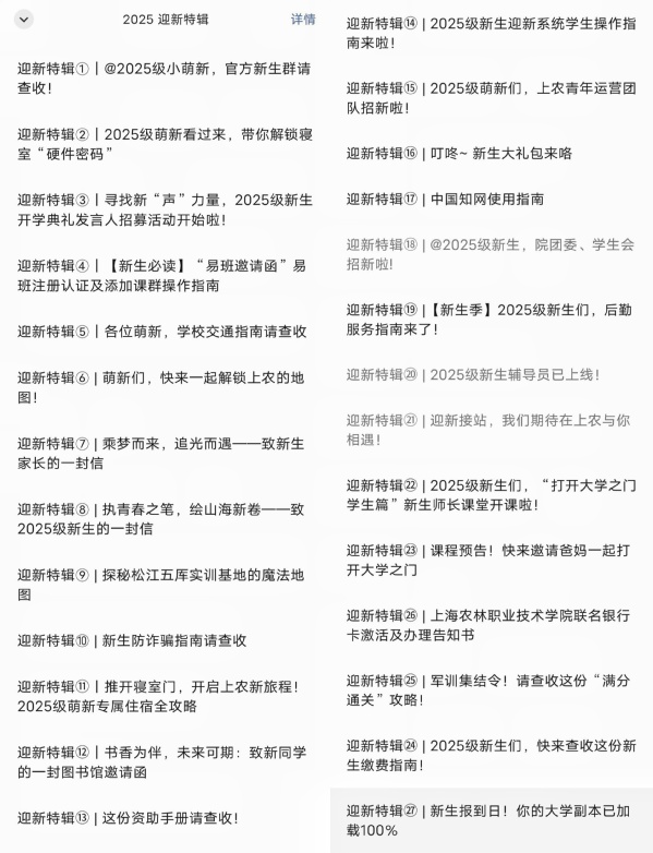 依托官方微信公众号上农青年推出“迎新特辑”系列推文,涵盖官方新生群、报到流程、校园风景、宿舍介绍、资助政策、新生缴费指南、后勤服务、图书馆介绍等实用内容,累计阅读量超2.3万次,积极发挥网络育人的主阵地、主平台、主渠道作用。