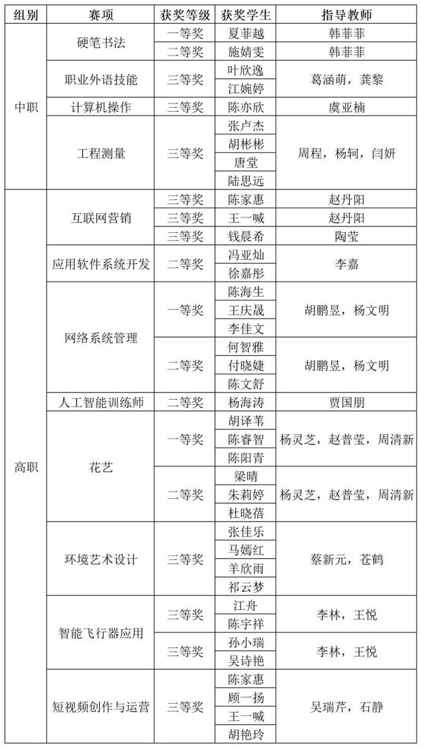 在高职组比赛中,我校学生共获奖13项,包括一等奖2项、二等奖4项、三等奖7项。其中,“花艺”赛项荣获团体第一名,“网络系统管理”赛项获团体第二名,“智能飞行器应用”赛项获团体第三名。中职组方面,我校学生共获5个奖项,包括一等奖1项、二等奖1项、三等奖3项。