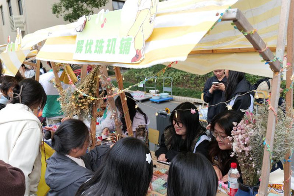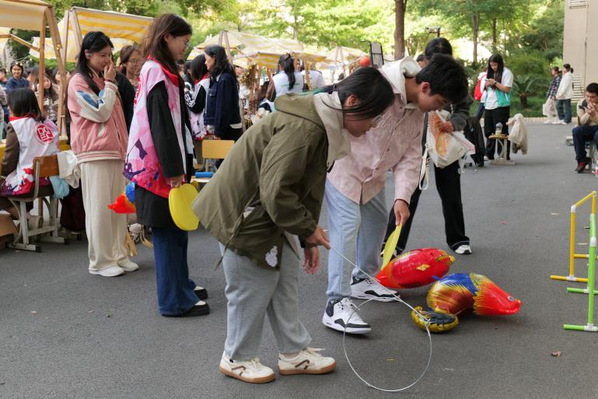 创意系·心晴乐园。“哎,你看我这铁环还能转这么久!”创意系“一环百应”摊位前,李同学正专注地操控着铁环在地面滚动。有趣的游戏玩法让不少师生驻足尝试,滚铁环时的专注与成功后的欢呼,让现场充满了童真的气息,大家在这个过程中暂时卸下压力,感受着解压游戏带来的轻松与快乐。