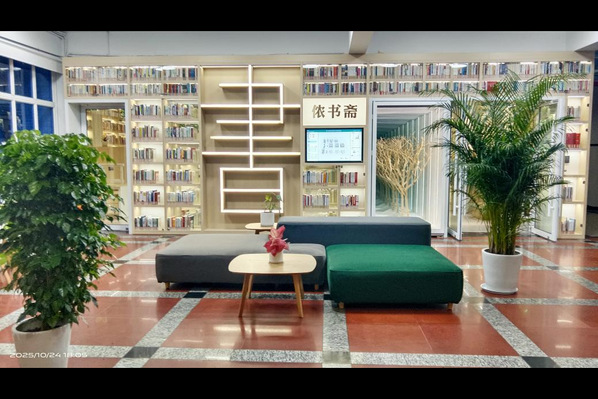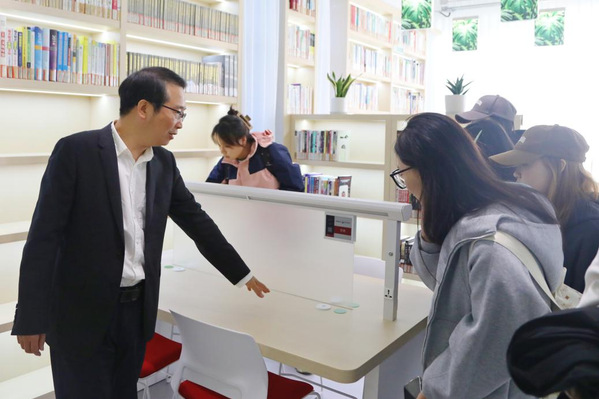 师生们分批次进入侬书斋参观。该智能化侬书斋可容纳藏书两万册,图书仅供阅览,不提供外借服务。书斋实现了多项智能管理功能:自动统计进出人数,覆盖高速无线网络,配备多角度超高清红外摄像头进行全方位监控;室内灯光、窗帘和空调均可智能调控。阅读座位支持小程序预约,预约成功后签到入座,系统自动开启个人用电,离座后自动断电。