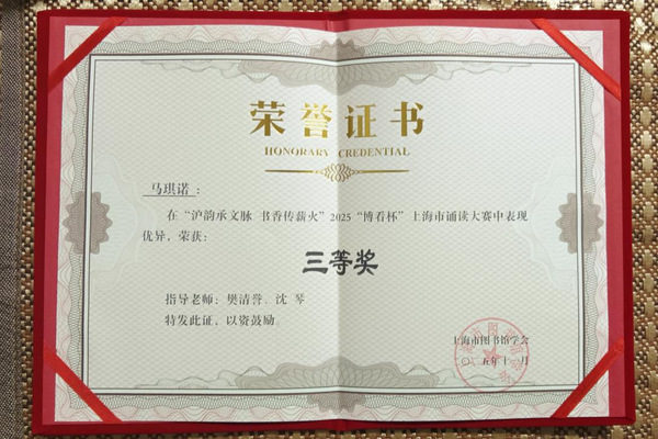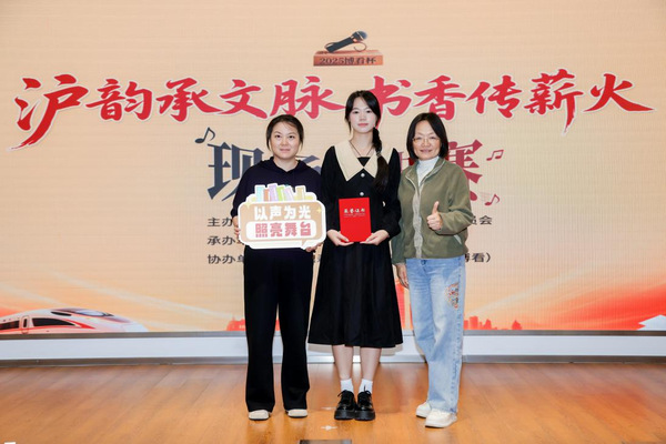 11月7日,由上海市图书馆学会阅读推广委员会主办的“沪韵承文脉·书香传薪火”2025“博看杯”上海市诵读大赛决赛落幕,我院图书馆选派“四·时”读书社成员马琪诺同学参赛,凭借汪国真作品《走向远方》,经过单位选拔、网络投票与专家评审等多轮环节的激烈角逐,成功入围全市22个决赛名额,代表学校登上市级决赛舞台,并最终荣获三等奖。本次比赛的指导老师为图书馆馆长樊清誉和沈琴老师。