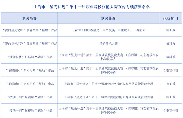 上海市“星光计划”第十届职业院校技能大赛宣传专项评选结果近期公布,学院宣传成果丰硕,共荣获8个奖项。学院被评为“优秀组织单位”,同时在“我的星光之路”参赛故事、“技能筑梦”好新闻、“星耀瞬间”新闻照片、“技动一刻”短视频等多个专项评选中表现优异,展现了学院良好的精神风貌与宣传实效。