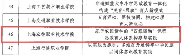 近日,中共上海市教育卫生工作委员会、上海市教育委员会公布了2025年上海市立德树人机制综合改革试点典型工作案例入选名单,我院申报的《基于农匠精神的“四维四融”课程思政育人体系构建与实践》案例,经单位推荐和市级评审,从全市众多优秀案例中脱颖而出,入选2025年上海市立德树人机制综合改革试点典型工作案例,跻身全市百项典型案例行列。
