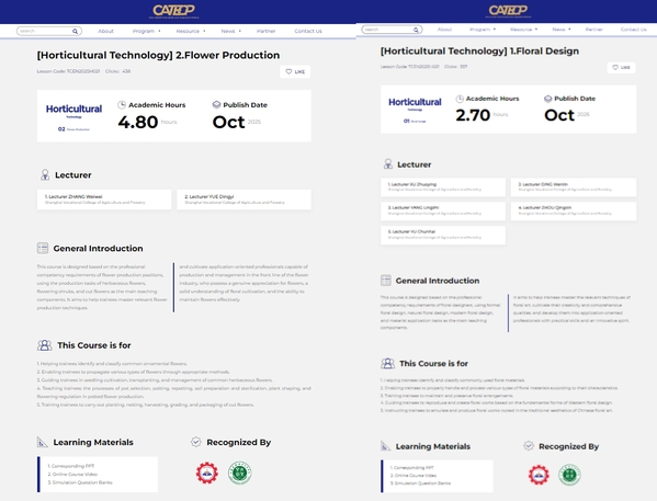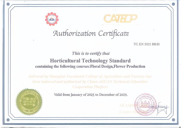 在课程建设与教学创新方面,聚焦园艺疗养、都市康养等前沿领域,对接马来西亚健康生活理念与国情,成功开发《花卉生产》《插花艺术》两门核心课程,配套视频与PPT共124个,全面推进双语化教学改革。目前,两门课程标准已通过CATECP认证,正式纳入平台体系并获颁课程认证证书。课程植根深厚的专业积淀与校企融合机制,以系统化双语教学培养具备全球视野的花卉与花艺技术人才。相关成果已辐射至老挝等东南亚国家,并将持续输出核心课程,构建“课程出海、标准共建”的可持续赋能体系,为“一带一路”沿线国家本土化人才培养注入持久动力。