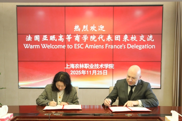 推进会最后,陈立婧与杜勒沙分别代表上海农林职业技术学院和法国亚眠庇卡底高等工商教育集团,共同签署《2026年“数字经济管理类专业学分互认课程班”项目合作协议》,双方对合作前景充满信心。