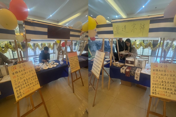 互动体验环节中,学生们现场演示非遗技艺,如松江老布锦囊制作、宋锦包制作、金山莲香糕与叶榭青龙饺制作等,邀请师生动手参与,让大家在亲身体验中深刻感受非遗的独特魅力。