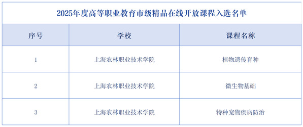 近日,上海市教委公示2025年度高等职业教育市级精品在线开放课程拟入选名单,我院《植物遗传育种》《微生物基础》《特种宠物疾病防治》三门课程成功获批2025年度市级精品在线开放课程立项。目前,学院已经拥有国家级(在线)精品课程5门、国家级精品资源共享课1门、市级精品(在线开放)课程32门、校级精品在线开放课程56门。