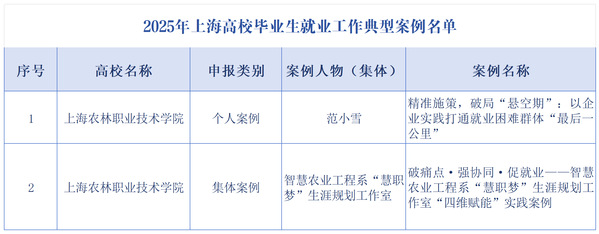 近日,上海市教育委员会公布2025年上海高校毕业生就业工作典型案例名单,学院两项案例入选,分别是范小雪老师的个人案例和智慧农业工程系“慧职梦”生涯规划工作室的集体案例,成为全市高校毕业生就业工作标杆。