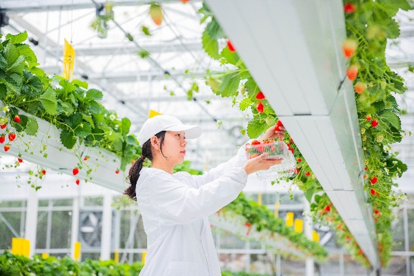 据悉,温室草莓悬挂栽培智能化种植生产技术是我院独立研发的技术成果。该技术涵盖环境调控、水肥管理到智能设备操作、数据追溯等全流程技术要求。种植系统采用电动可升降吊挂式立体栽培方式,可将种植槽悬挂在空中通过控制不同种植槽高度,形成可升降式和固定吊挂式高架基质栽培草莓,造出“草莓天瀑”景观。