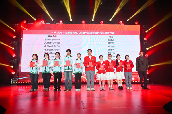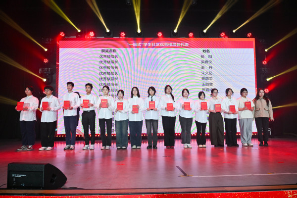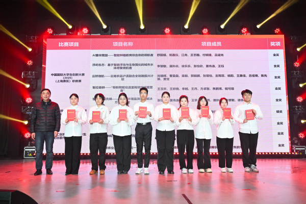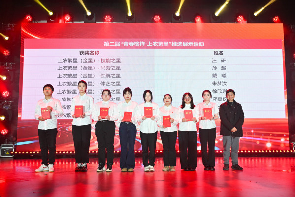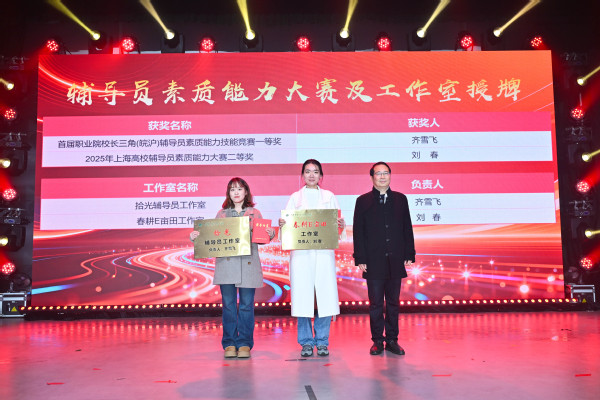 文艺汇演现场,党委委员、副院长潘国俭为首届职业院校长三角(皖沪)辅导员素质能力技能竞赛和2025年上海高校辅导员素质能力大赛获奖的老师及她们的工作室授牌。晚会现场还对学院辅导员主题班会课说课比赛、中国国际大学生创新大赛(2025)(上海赛区)职教赛道选拔赛、第十九届“挑战杯”上海市大学生课外学术科技作品竞赛、第十届“汇创青春”上海大学生文化创意作品展示活动的获奖师生以及“青春榜样·上农繁星”金星代表、年度志愿服务标兵、第八届中国国际进口博览会优秀志愿者代表、学生一站式社区优秀楼层长代表进行表彰。党委委员、组织部部长杜波,关工委常务副主任俞锦禄,党委办公室、院长办公室主任费明,人事处处长张乐平,党委宣传部负责人司维为获奖学生代表颁奖。