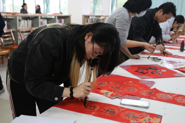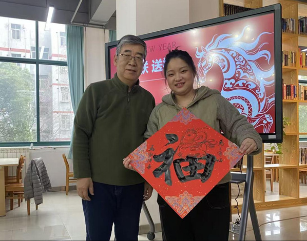 活动现场,人头攒动,师生们手拿着“福”字笑开了颜,过年气氛扑面而来。“郑老师,我姓马,要马上有福。”“朱老师,请写这副对联,我要马上有钱。”等候的师生们依次上前,从图书馆备好的联语集中挑选心仪的内容,向书法老师郑小云、朱柳扬表达各自的新春寄愿。两位老师悬腕运笔,笔锋如剑,起势若张弓蓄力,落墨似玉磬清鸣。墨痕在宣纸上徐徐润开,字迹时而如群鹤翔舞,时而又似孤舟静泊,行气布白间仿佛有呼吸般的韵律。得到墨宝的师生们欣喜不已,纷纷邀请书法老师合影留念。