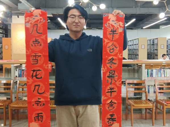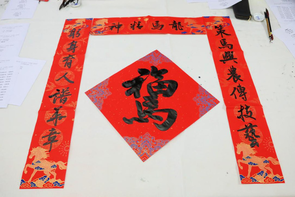 “我自己来写。”“四时”读书社的尹水仙同学主动提笔,写下“马到成功”四个大字。徐君泽手持自撰的“半含冬景半含春,几点雪花几点雨”拍照留念。卢涵卿在社团微信群中看到活动盛况,即刻赶到现场,见等候者众,便也取笔挥毫,很快融入这翰墨迎春的热潮之中。